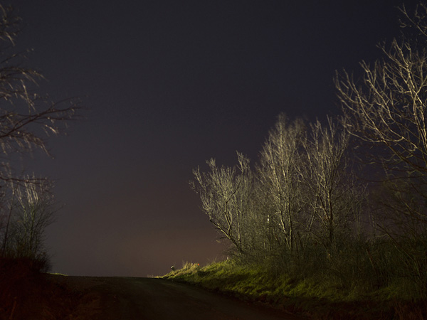 “Just shooting a rig during daylight wasn’t photographically interesting to me,” she said. But at night, the landscape changed. Methane flaring turned back roads orange, and the night sky at long exposures seemed on fire. Industrial lights from well pads cast an artificial glow on nearby homes, creating effects that, to Berman, were both ominous and entrancing.
