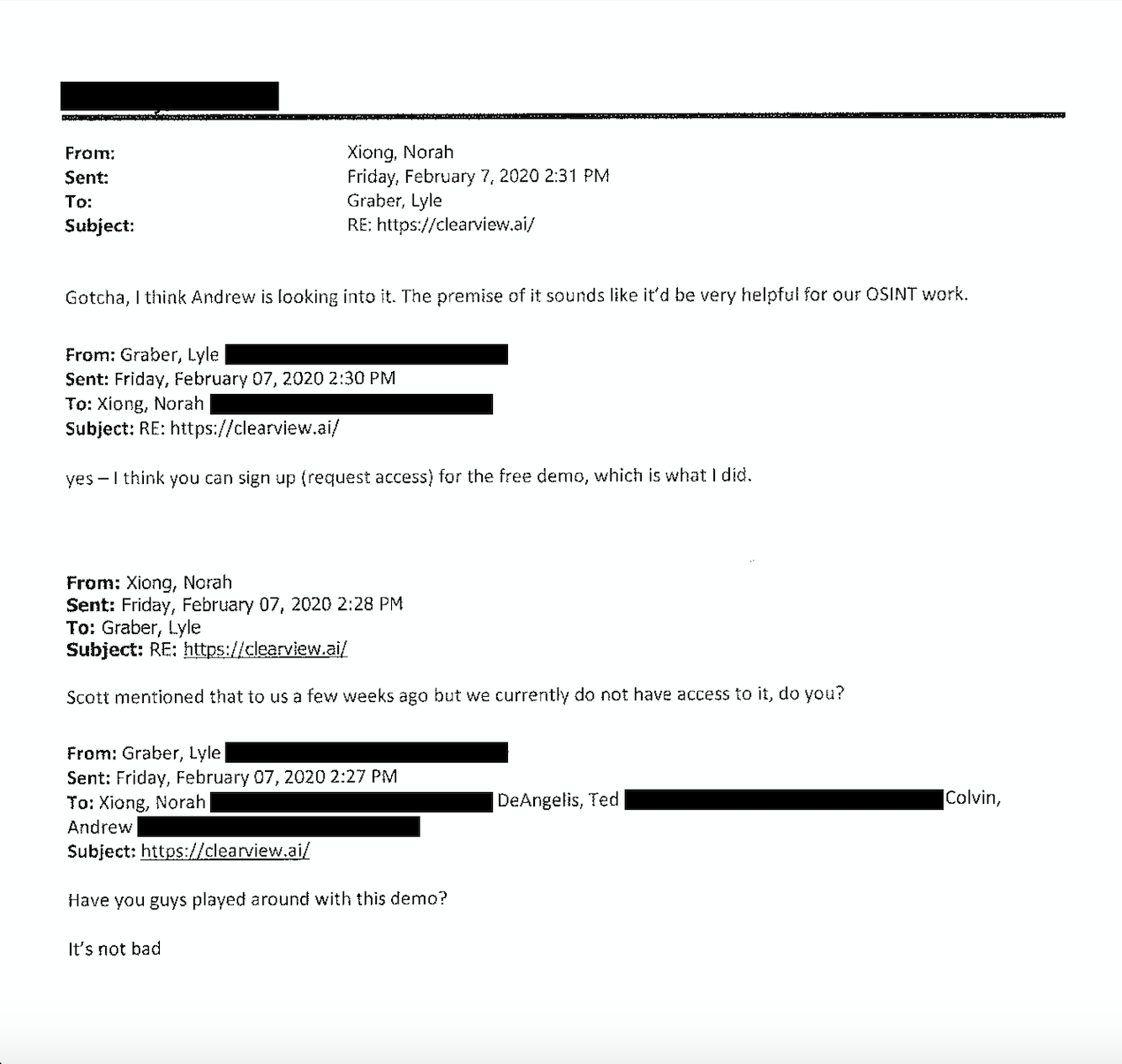 In an email dated Feb. 7, Xiong from the DA’s office wrote to colleagues that “the premise of [Clearview] sounds like it’d be very helpful for our OSINT work.”