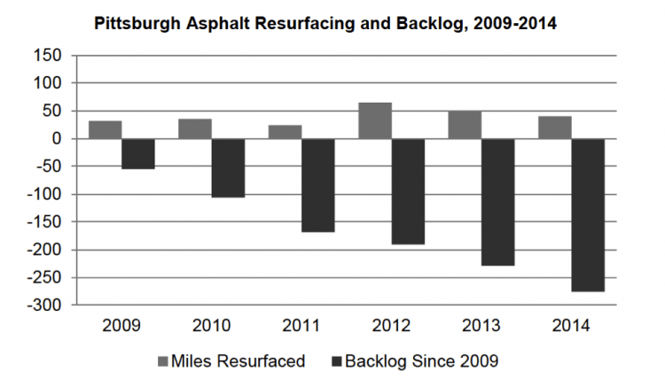 As you can see in this next chart from the Act 47 document, the city only fixed more than 50 linear miles once in the past five years. And the backlog is growing:
